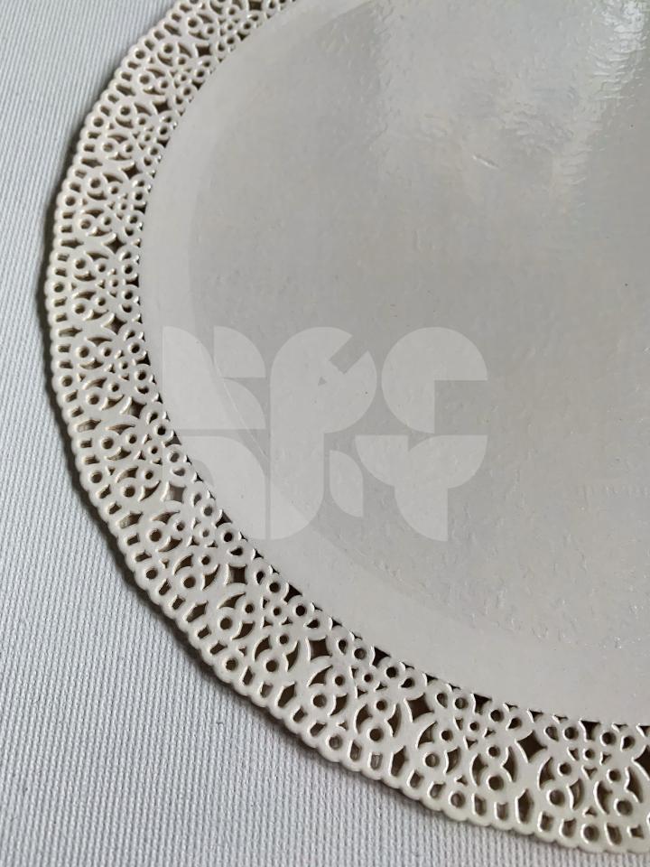 Kvalitný pevný podnos s priemerom 28cm a okrajom s krajkovým vzorom.