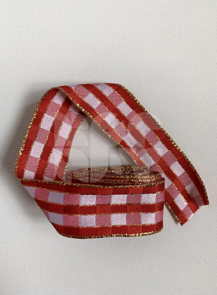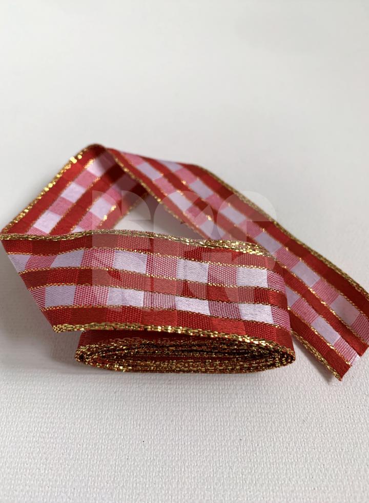 Károvaná polyesterová červeno-biela stuha so zlatým lurexovým obšitím a drôtom pre výborné tvarovanie so šírkou 27mm a dĺžkou 2m. Stuha je dekoratívna. Neodporúča sa prať ani žehliť.