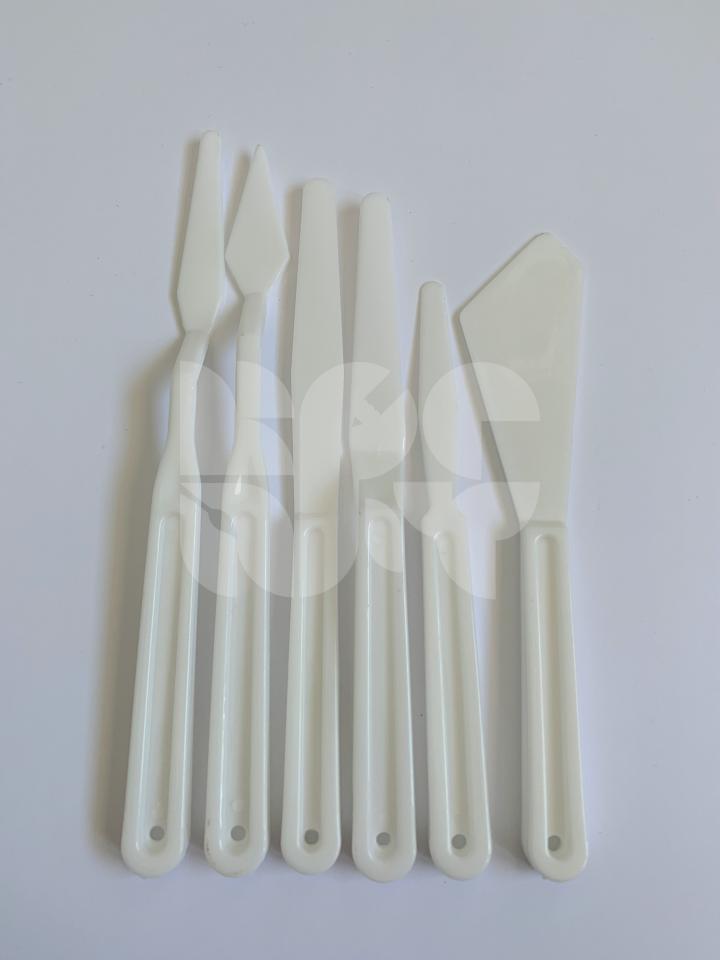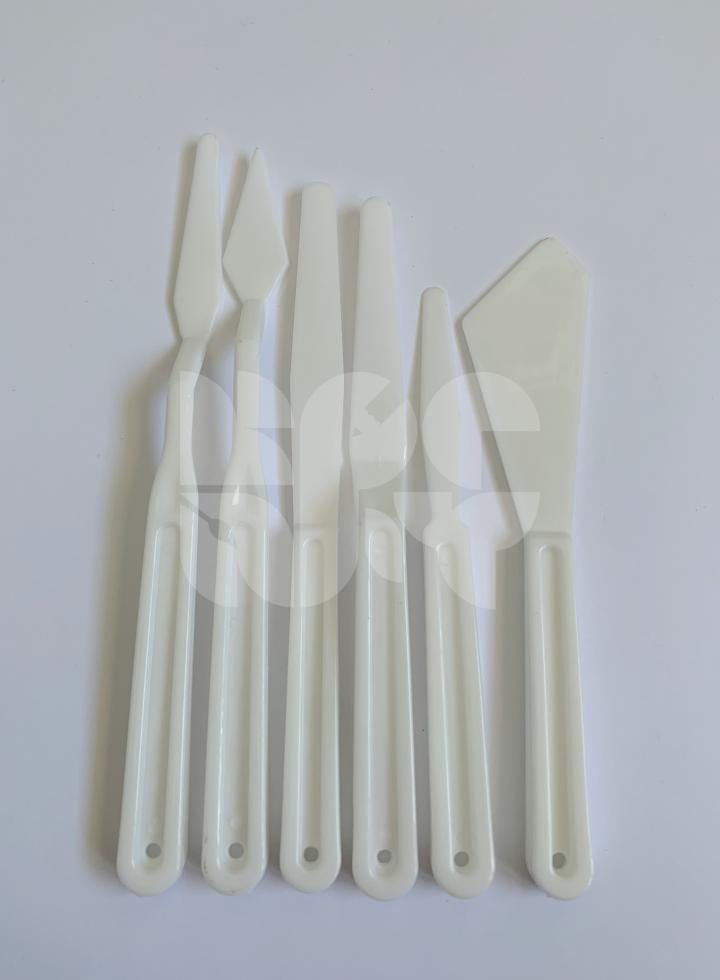Sada obsahuje 6kusov plastových špachtlí rôznych tvarov a veľkostí. Výborne sa hodia na nanášanie hustých farieb, rôznych štruktúrovacích pást a na ich rozotieranie.