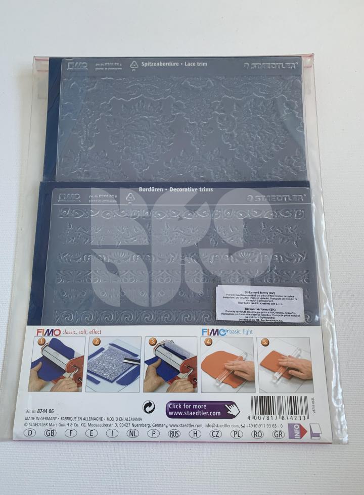FIMO silikónová podložka so štruktúrou. Balenie obsahuje 2 rozdielne vzory s rozmerom 168x150mm. Podložku môžete použiť pri práci s Fimo hmotou, samotvrdnúcimi hmotami, ale na odtlačanie farieb.