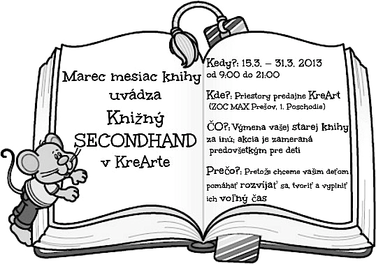 Keďže je MAREC MESIAC KNIHY, rozhodli sme sa túto myšlienku podporiť aj my! Príďte si k nám vymeniť Vašu STARÚ KNIHU, za nejakú INÚ...akcia je určená hlavne tým menším, no možno pri výmene natrafíte na niečo zaujímavé :) Aaaa detičky od nás neodídu naprázdno ;)